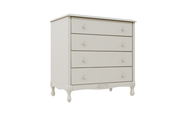 Um móvel com design de tom provençal, feito artesanalmente e com detalhes de entalhes manuais nas quatro espaçosas gavetas com puxadores.